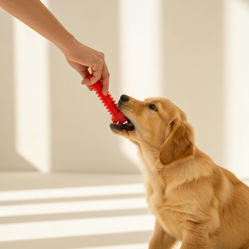 Statt deiner Hand sollte dein Junghund lieber auf geeignetem Hundespielzeug herumkauen. Achte darauf, dass das Spielzeug robust ist und dein Hund sich nicht verletzen kann. Spielzeuge zum Kauen helfen auch beim Zahnwechsel.