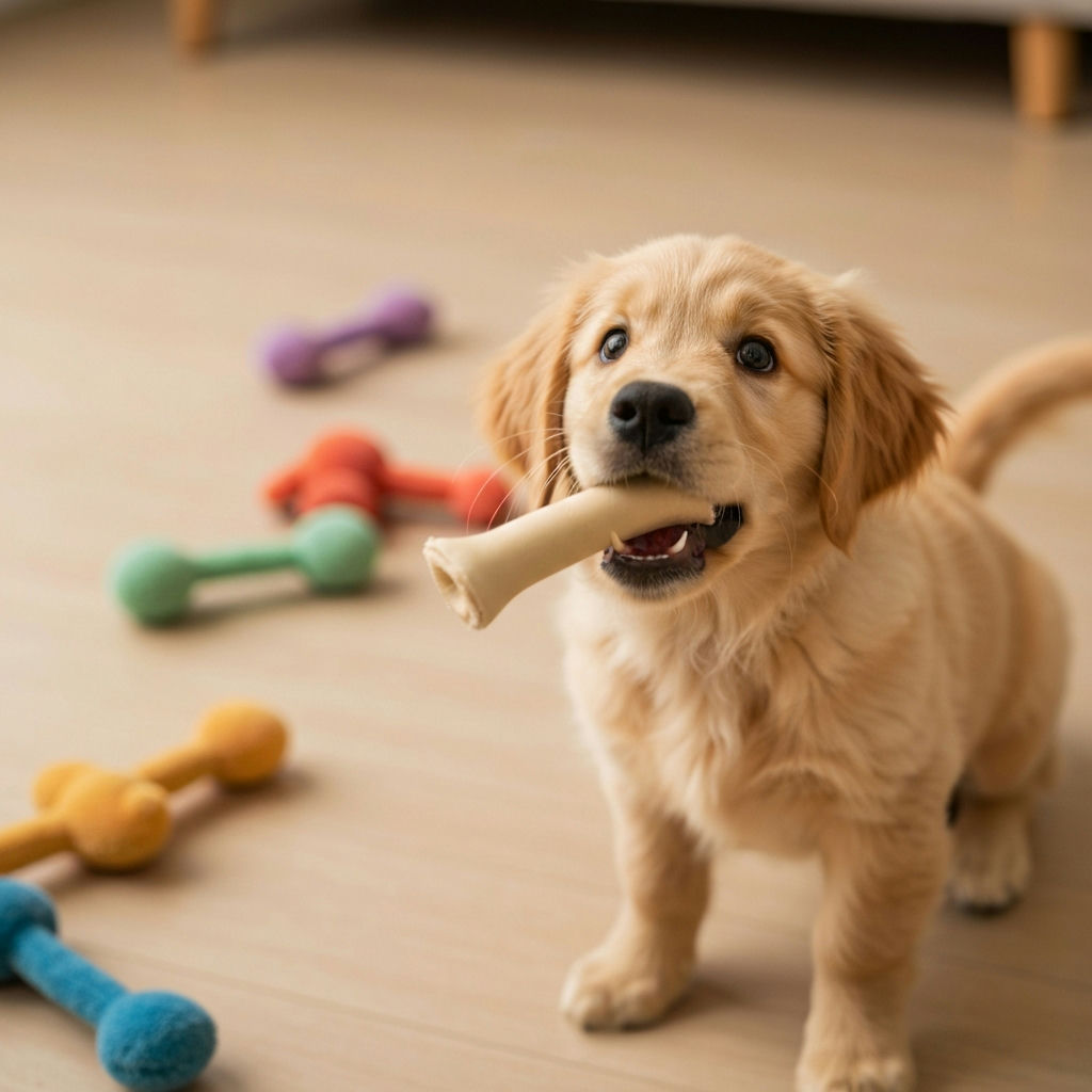 Gib deinem Welpen Kauspielzeug oder spezielle Beißringe, um seinen natürlichen Kautrieb auszuleben. Das hilft besonders während des Zahnwechsels.