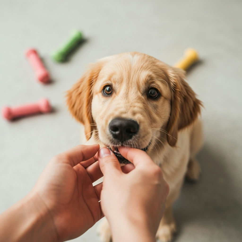 - Kauartikel: Spezielle Welpen-Kauknochen oder Beißspielzeug lindern das Zahnen.