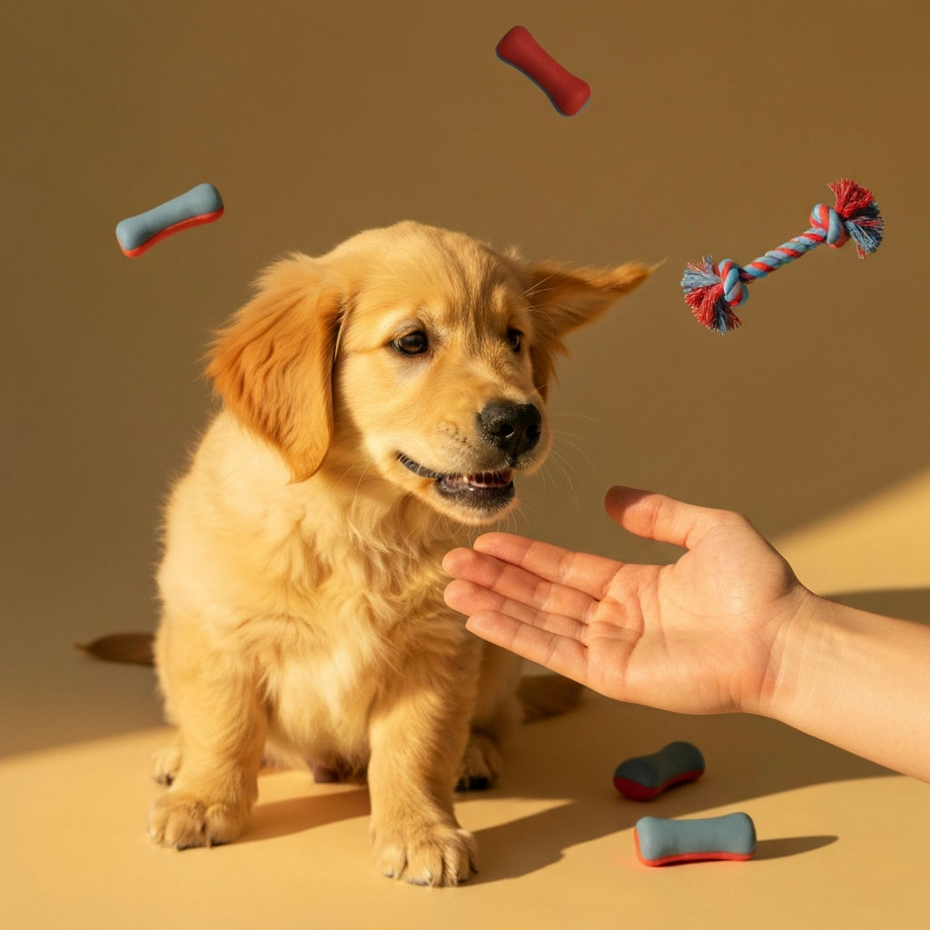 Lenke deinen Welpen auf ein geeignetes Kau- oder Spielzeug um, wenn er beim Spielen zu wild wird. So lernt er, dass es okay ist, zu kauen – aber nicht an dir.