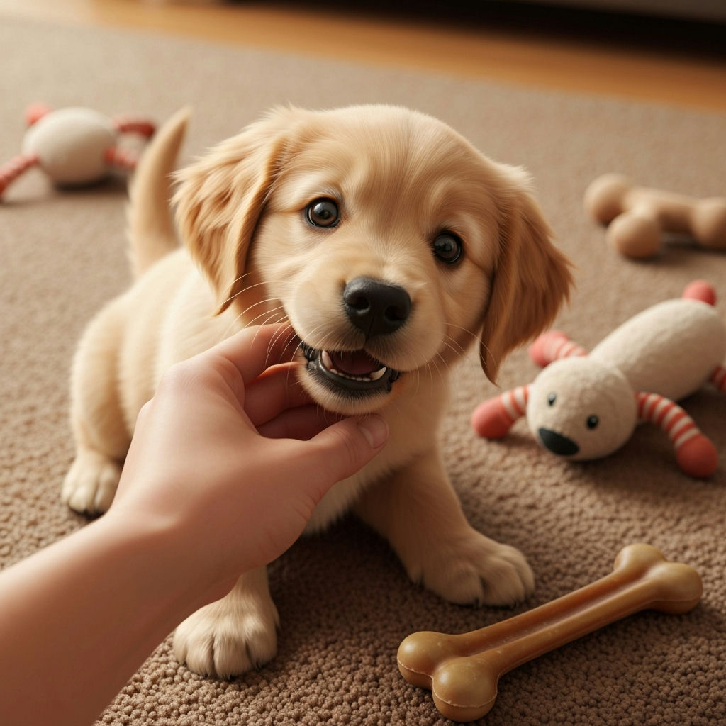 Gib deinem Welpen geeignetes Kauspielzeug, damit er seine Beißlust ausleben kann. Kauknochen oder spezielle Welpenspielzeuge sind ideal. Eine Übersicht zu sinnvollem Spielzeug findest du auf Planet Hund.